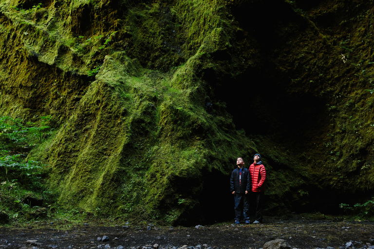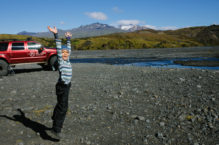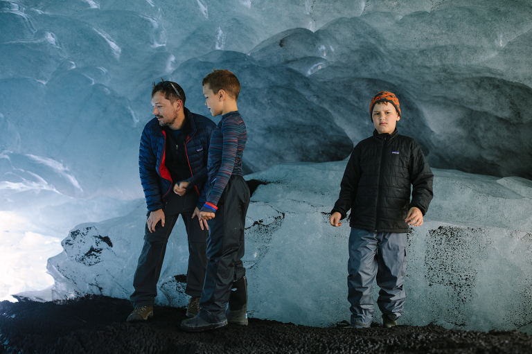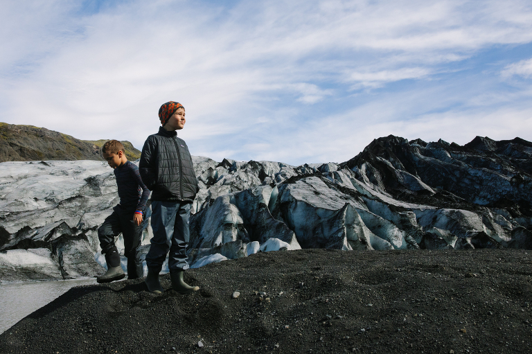 10:00 Sólheimajökull. Driving east on Route 1, there is a small turn off toward the glacier. From here, you can do guided glacier walks, which we did back in 2015. When researching our stops, we originally eliminated this one, because Sawyer’s feet are too small to use the crampons, so he wouldn’t have been able to walk along the glacier. But, it was perfect, because even if we didn’t walk ON the glacier, we got close enough to see it and were able to climb under one part that was marked, and the boys were awestruck when they got to run their fingers along the surface of it.