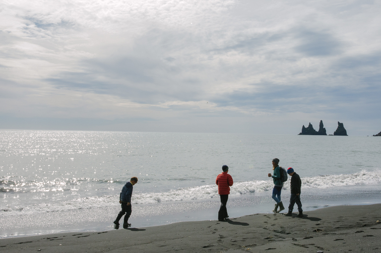 11:30 Vík í Mýrdal. We parked at the tourist stop for bathroom breaks and access to the black sand beach here. It was a gorgeous day, we walked along the beach and it was warm enough to shed some layers and Sawyer even put his feet in the water. We hiked to the end of the beach and back, grabbed a snack and moved on to . . .